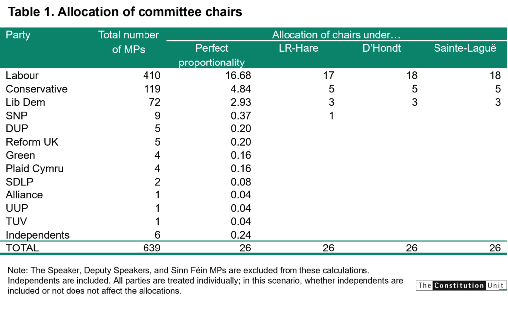 Because the evaluation above reveals, completely different strategies for allocating committee chairs and memberships result in completely different outcomes. Within the pursuits of equity and transparency, it could be fascinating for a selected method to be agreed and made public. The events may nonetheless deviate from the rule-based allocation in the event that they wished; however the start line for inter-party negotiations can be unambiguous.